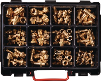 handliche Kunststoff-Sortimentsbox mit reduzierter Bestückung, beinhaltet die gängigsten Tüllen, Doppelnippel und Reduziernippel