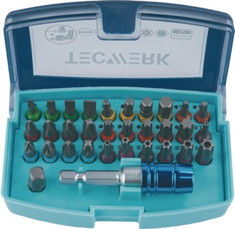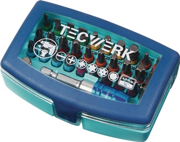 bestückt mit zähharten Bits mit Farbleitsystem und Bithalter mit Schnellwechselfutter und drehbarer Führungshülse · für Bits C 6,3 + E 6,3 (auch für lange Bits) · für Hand- und Maschinenbetrieb (konv. Akkuschrauber) Inhalt: 1 Bit-Halter (65 mm) je 1 Bit für Schlitzschrauben (grün) Gr. 3 / 4 / 5 / 6 mm je 1 Bit für Schrauben mit Kreuzschlitz (PH) (rot) Gr. 1 / 3 2 Bits für Schrauben mit Kreuzschlitz (PH) (rot) Gr. 2 je 1 Bit für Schrauben mit Kreuzschlitz (PZD) (blau) Gr. 1 / 3 2 Bits für Schrauben mit Kreuzschlitz (PZD) (blau) Gr. 2 je 1 Bit für Schrauben mit Innen-TORX®-Profil (orange) Gr. T 10 / 15 / 20 / 25 / 27 / 30 / 40 je 1 Bit mit Bohrung für Schrauben mit Innen-TORX®-Profil (dunkel pink) (auch mit Sicherungsstift) Gr. T 10 / 15 / 20 / 25 / 27 / 30 / 40 je 1 Bit für Schrauben mit Innensechskant-Profil (gelb) Gr. 3 / 4 / 5 / 6 mm 1 Adapter 6,3 mm (1/4")-Außenvierkant auf 6,3 mm (1/4")-Außensechskant zum maschinellen Antrieb (konv. Akkuschrauber) von Steckschlüssel-Einsätzen Weitere technische Eigenschaften: · Antrieb mm: 6,3mm · Verpackung: in Kunststoffbox · Antrieb: 1/4 "