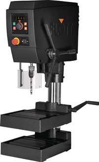 Gewindeschneideinrichtung · LED-Beleuchtung · Bohrschutz mit elektrischer Absicherung · Unterspannungsauslöser und thermischer Überlastungsschutz · digitale Bohr-, Gewindeschneidtiefen- und Drehzahlanzeige · Anschlusskabel mit Stecker (1,5 m) · Not-Aus-Schlagtaster · Tischhöhenverstellung über Zahnstange · bearbeitete Fußplatte und Zwischentisch · Spindelstop Weitere technische Eigenschaften: · Aufspannfläche: 340 x 280mm · Gewicht: 121kg · Säulen-Ø: 82mm · prüfpflichtig: ja · Motorleistung: 0,75kW